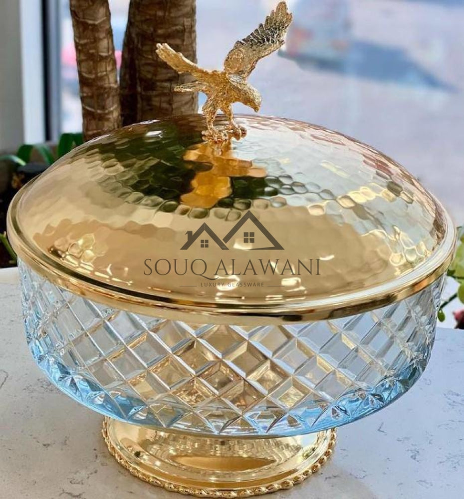 طبق تقديم زجاجي بديكورات نحاسية مع غطاء نحاسي